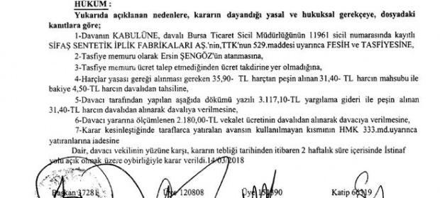 Türkiye'nin en eski tekstil tesislerinden biri olan Bursa merkezli Sifaş Tektsil’in tasfiyesine karar verildi. Nergis Holding iştiraki olan şirket için mahkemeye yapılan başvuru sonrası tasfiye kararı çıktı.