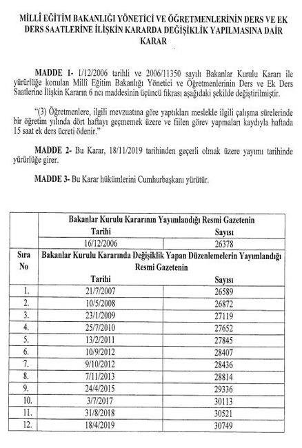 İlgili maddede yapılan düzenleme Resmi Gazete'de yayımlanarak yürürlüğe girdi ve bu sınır iki haftadan dört haftaya çıkarıldı. Kararla birlikte öğretmenler ara tatillerdeki çalışmaları nedeniyle de ek ders alabilecek.