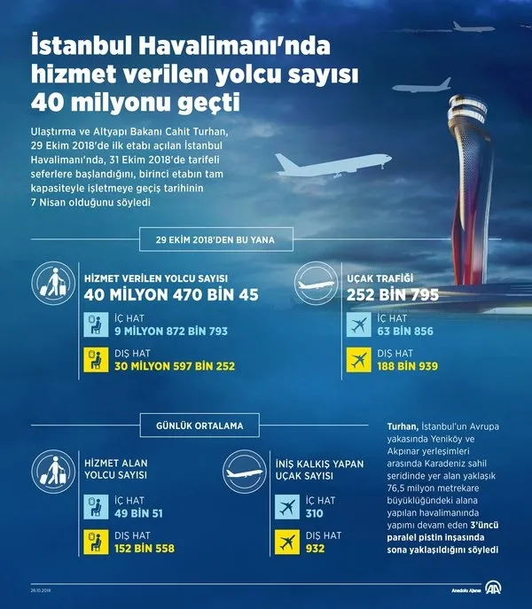 Açılışından bugüne kadar iç hatlarda 63 bin 856, dış hatlarda 188 bin 939 olmak üzere, toplamda 252 bin 795 uçak trafiği gerçekleştirildiğini aktaran Turhan, "İstanbul Havalimanı'nda, açılışından bugüne kadar iç hatlarda 9 milyon 872 bin 793, dış hatlarda 30 milyon 597 bin 252 olmak üzere, toplamda 40 milyon 470 bin 45 yolcuya hizmet verildi." demişti.
