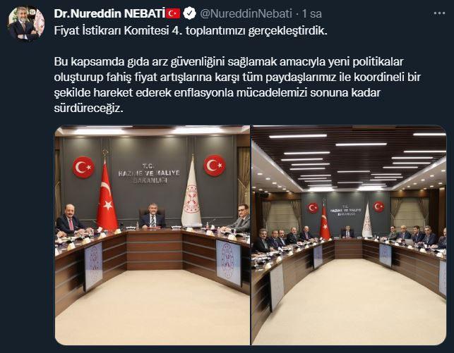 Nebati, Twitter hesabından yaptığı paylaşımda, Fiyat İstikrarı Komitesinin 4. toplantısını gerçekleştirdiklerini ifadede ederek, "Bu kapsamda gıda arz güvenliğini sağlamak amacıyla yeni politikalar oluşturup fahiş fiyat artışlarına karşı tüm paydaşlarımız ile koordineli bir şekilde hareket ederek, enflasyonla mücadelemizi sonuna kadar sürdüreceğiz." değerlendirmesinde bulundu.