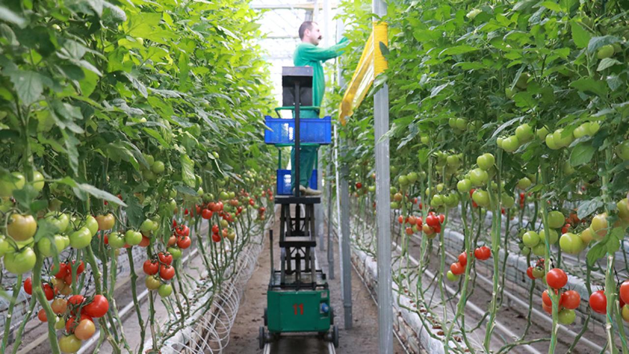 Soğuk kış günlerinde bile üretimin aksamadığı serada üretilen domates, yurt içine pazarlanıyor.