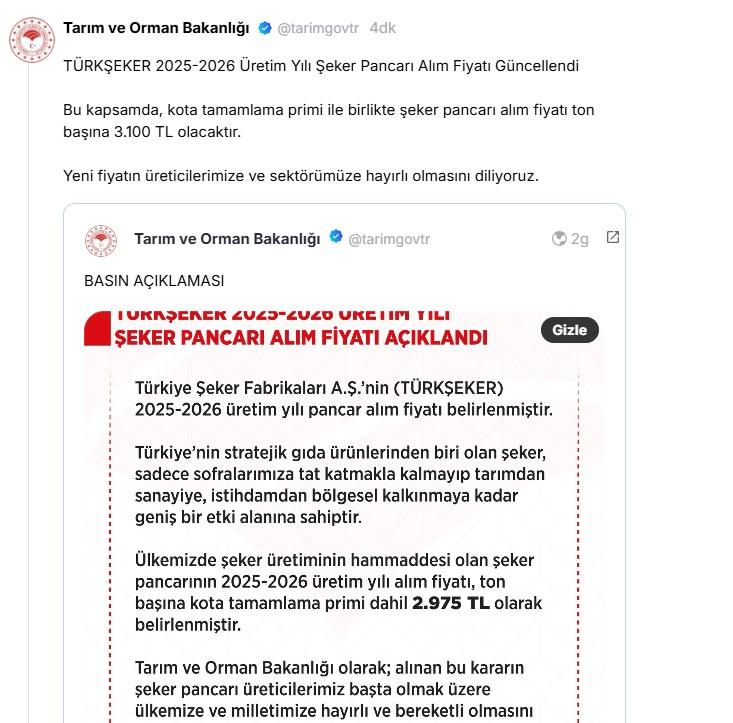 Bakanlığın sosyal medya hesabından yapılan açıklamada, "TÜRKŞEKER 2025-2026 üretim yılı şeker pancarı alım fiyatı güncellendi. Bu kapsamda, kota tamamlama primi ile birlikte şeker pancarı alım fiyatı ton başına 3 bin 100 TL olacaktır. Yeni fiyatın üreticilerimize ve sektörümüze hayırlı olmasını diliyoruz” denildi.