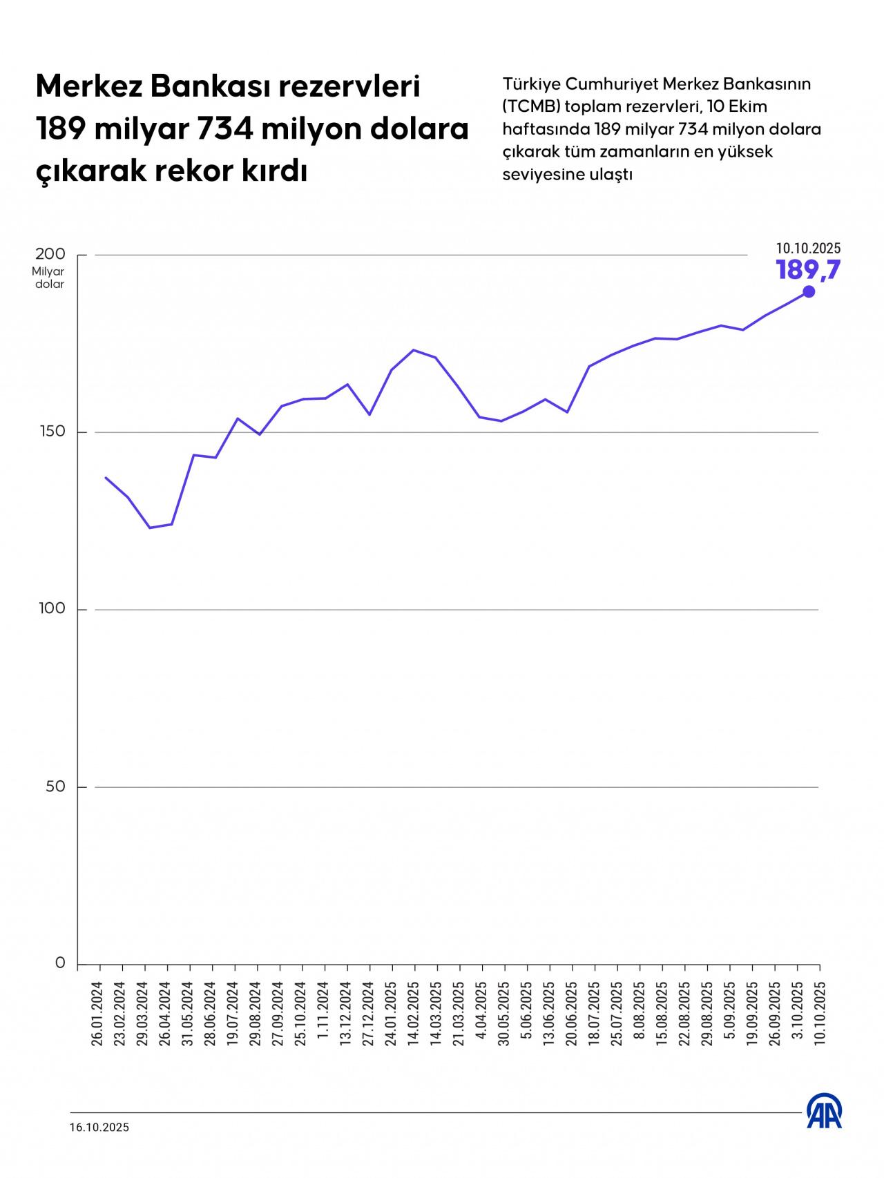 Türkiye Cumhuriyet Merkez Bankasının (TCMB) toplam rezervleri, 10 Ekim haftasında 189 milyar 734 milyon dolara çıkarak tüm zamanların en yüksek seviyesine ulaştı.