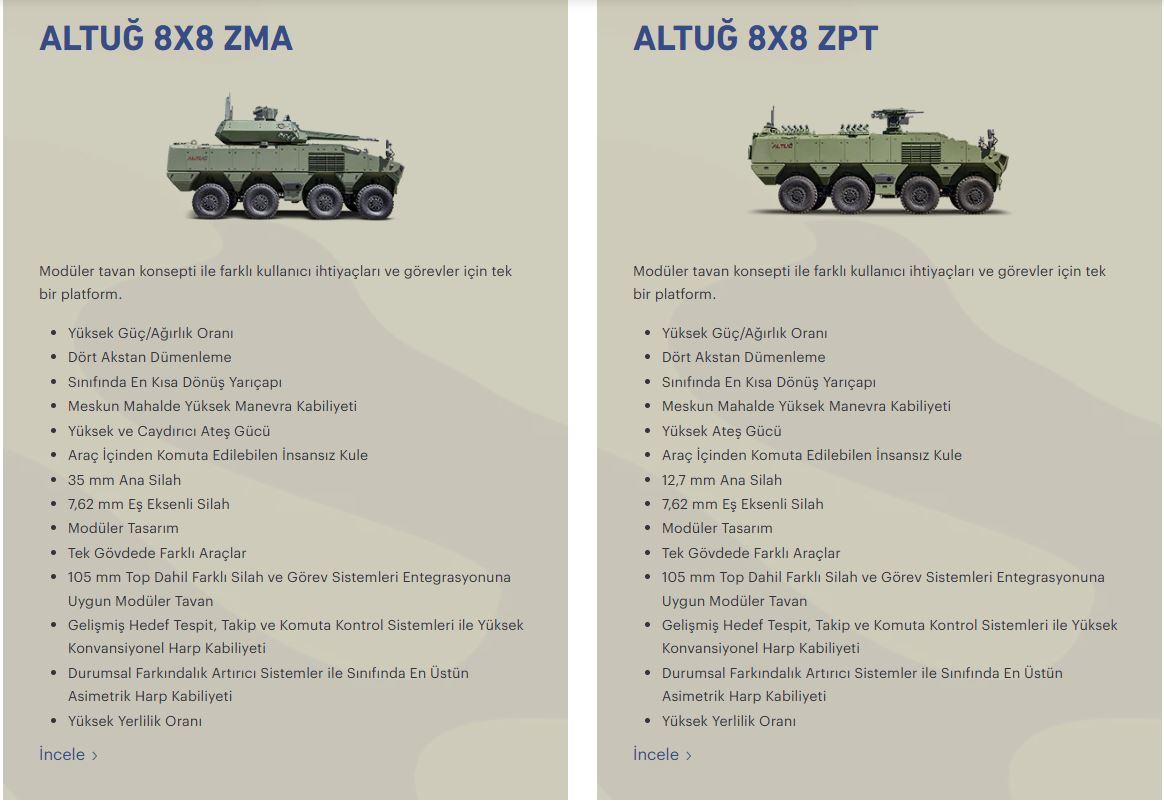 ALTUĞ 8x8 Zırhlı Muharebe Aracı, 35 mm ve 12,7 mm silah kuleli versiyonlarıyla sahada etkinliğini kanıtlarken, 105 mm silah kuleli "Tank Avcısı" versiyonu ilk kez sergilendi. ALTUĞ 8x8 serisi araçlarda yüzde 80'lere varan yüksek yerlilik oranı hedefleniyor. Araçların tüm versiyonlarda bulunan yerli ve milli aks donanımlarına ilave olarak 12,7 milimetre silah kuleli 8x8 ve 6x6 versiyonlarında yerli motor da kullanılacak şekilde çalışmalar sürdürülüyor.
