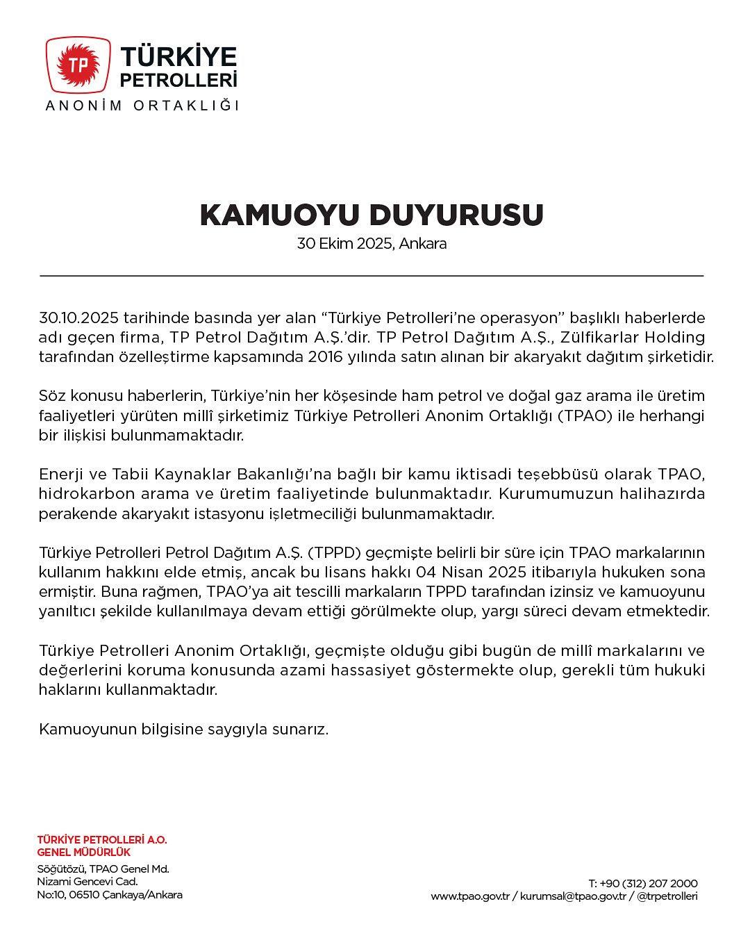 Türkiye Petrolleri Anonim Ortaklığı (TPAO) “Türkiye Petrolleri’ne operasyon” başlıklı haberler üzerine açıklama yaparak kamuoyunu bilgilendirdi.