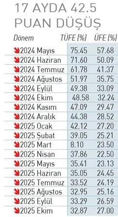 Mayıs 2024'te yüzde 75.45 olan yıllık enflasyon 15 ay art arda düşerek 2025'in Ağustos ayında yüzde 32.95'e gerilemişti. Eylülde geçici artışla yüzde 33.29'a yükselen yıllık enflasyon ekimde yüzde 32.87'ye inerek, 2024 Mayıs ayından bu yana böylece toplamda 42.58 puan gerilemiş oldu. ilk 10 aydaki enflasyon yüzde 28.63 oldu.