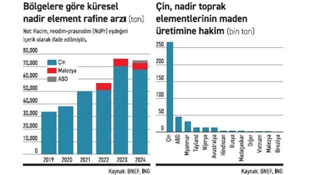 Çin, 1990’lardan bu yana düşük maliyetli üretimi, çevre toleranslı politikaları ve yoğun devlet desteğiyle bu sektörde mutlak hâkimiyet kurdu. Bugün küresel NTE maden üretiminin yüzde 70’ini, rafinasyonunun yüzde 90’ını ve mıknatıs üretiminin neredeyse tamamını gerçekleştiriyor. Bu da kritik teknolojilerdeki tedarik zincirlerinin büyük ölçüde Pekin’e bağlı olduğu anlamına geliyor.