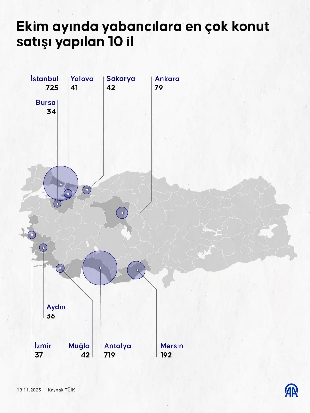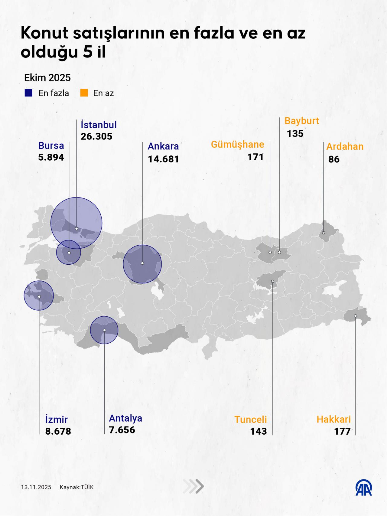 İstanbul, 26 bin 305 ile ekimde en çok konutun satıldığı il oldu. Bu ili 14 bin 681 konut satışıyla Ankara, 8 bin 678 ile İzmir takip etti.