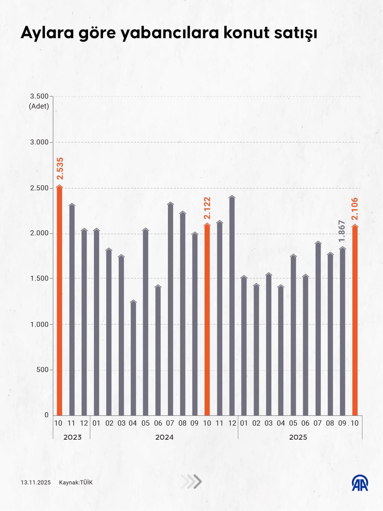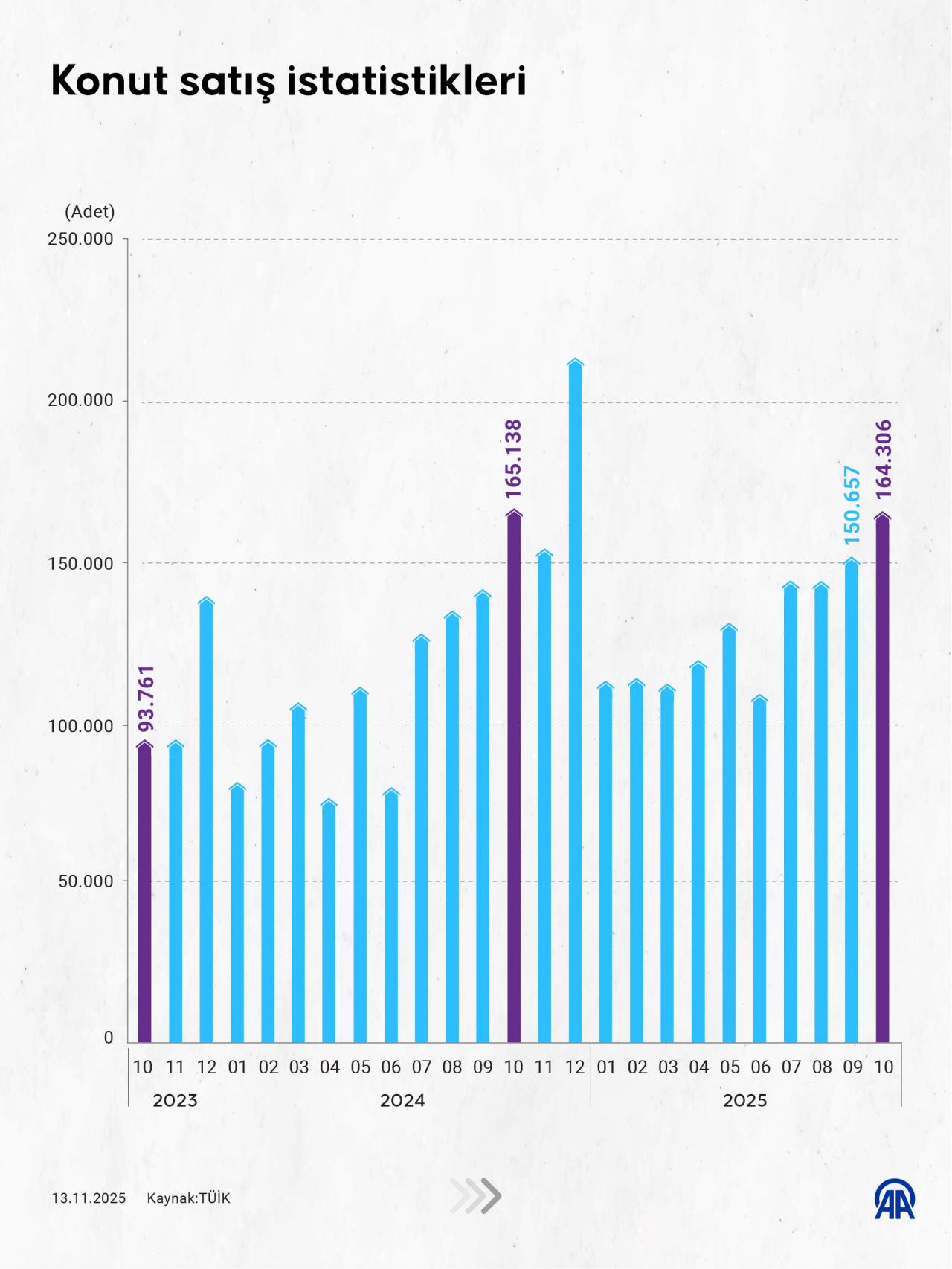 Buna göre Türkiye genelinde konut satış sayısı, ekimde geçen yılın aynı ayına kıyasla yüzde 0,5 azalarak 164 bin 306'ya geriledi.