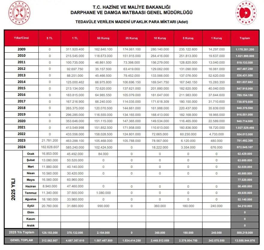 2025 yılına ait verilerde toplamda 509 milyon 219 bin liralık madeni ufaklık para birimi basıldığı açıklandı. Yeni Türk Lirası YTL'nin kaldırılması ve TL olarak devam ettirilmesi nedeniyle 2009 yılından bu yana basılan ve tedavülde olan 13 milyar 588 milyon 944 bin 976 liralık madeni ufaklık para piyasada dolaşım halinde bulunuyor.