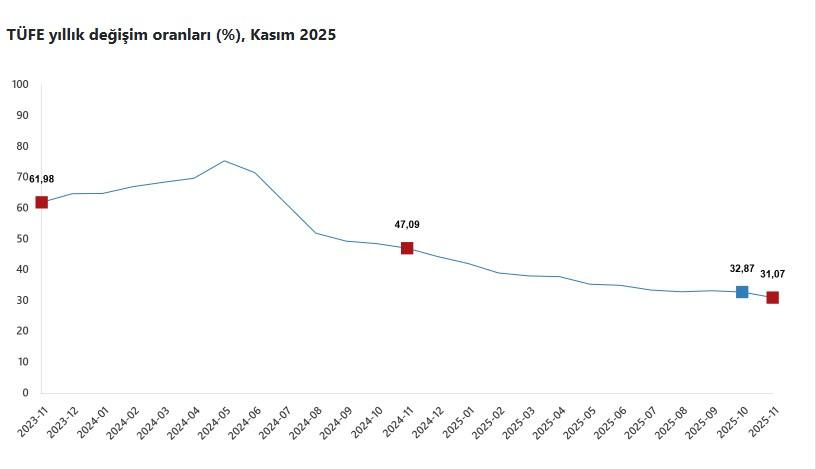 Türkiye İstatistik Kurumu'nun açıkladığı rakamlara göre TÜFE'deki değişim 2025 yılı Kasım ayında bir önceki aya göre yüzde 0,87 artış, bir önceki yılın Aralık ayına göre yüzde 29,74 artış, bir önceki yılın aynı ayına göre yüzde 31,07 artış ve on iki aylık ortalamalara göre yüzde 35,91 artış olarak gerçekleşti.