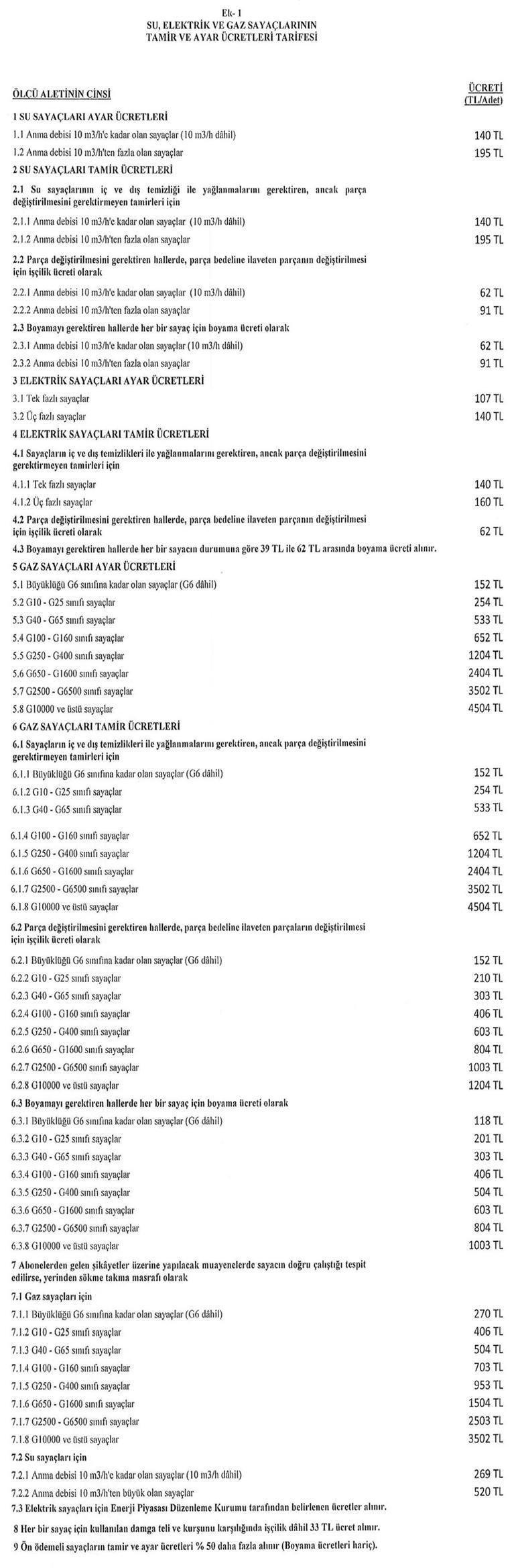 Muayene ve damgalama bedelleri gaz sayaçları için sınıfına göre 107 lira ile 855 lira, su sayaçları için anma debisine göre 23 lira ile 118 lira, elektrik sayaçları için ise 62 lira ile 464 lira arasında değişecek.