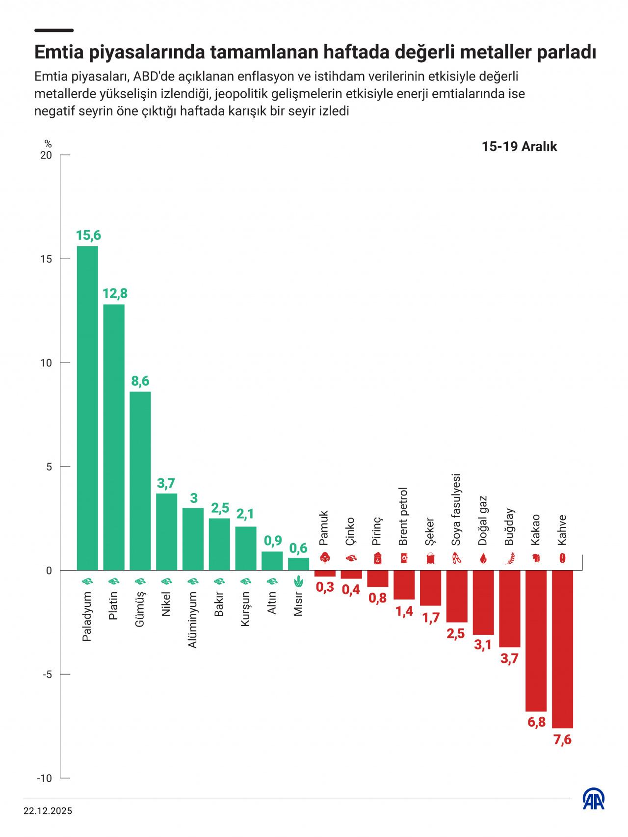 Diğer taraftan platin ve paladyum fiyatları, bu yıl arz sıkıntısı nedeniyle sert yükseldi. Madencilik arzındaki daralma, gümrük tarifelerindeki belirsizlik ve altına yönelen yatırımcıların kısmen bu metallere dönmesi platin ve paladyumun yükselişinde etkili oldu.