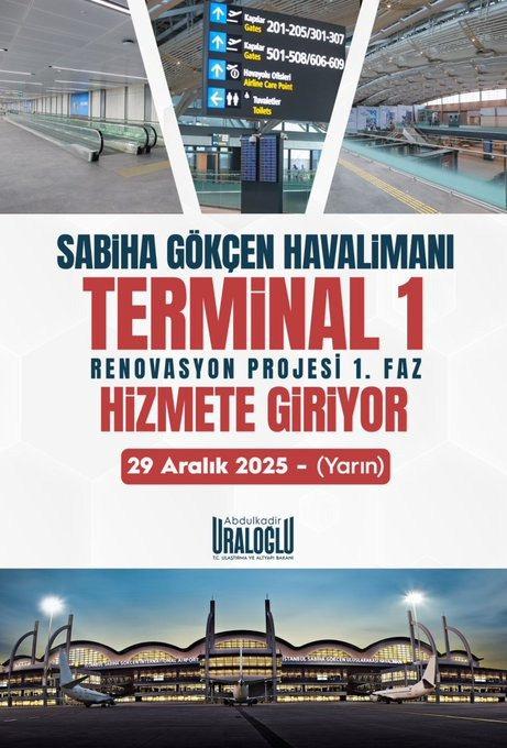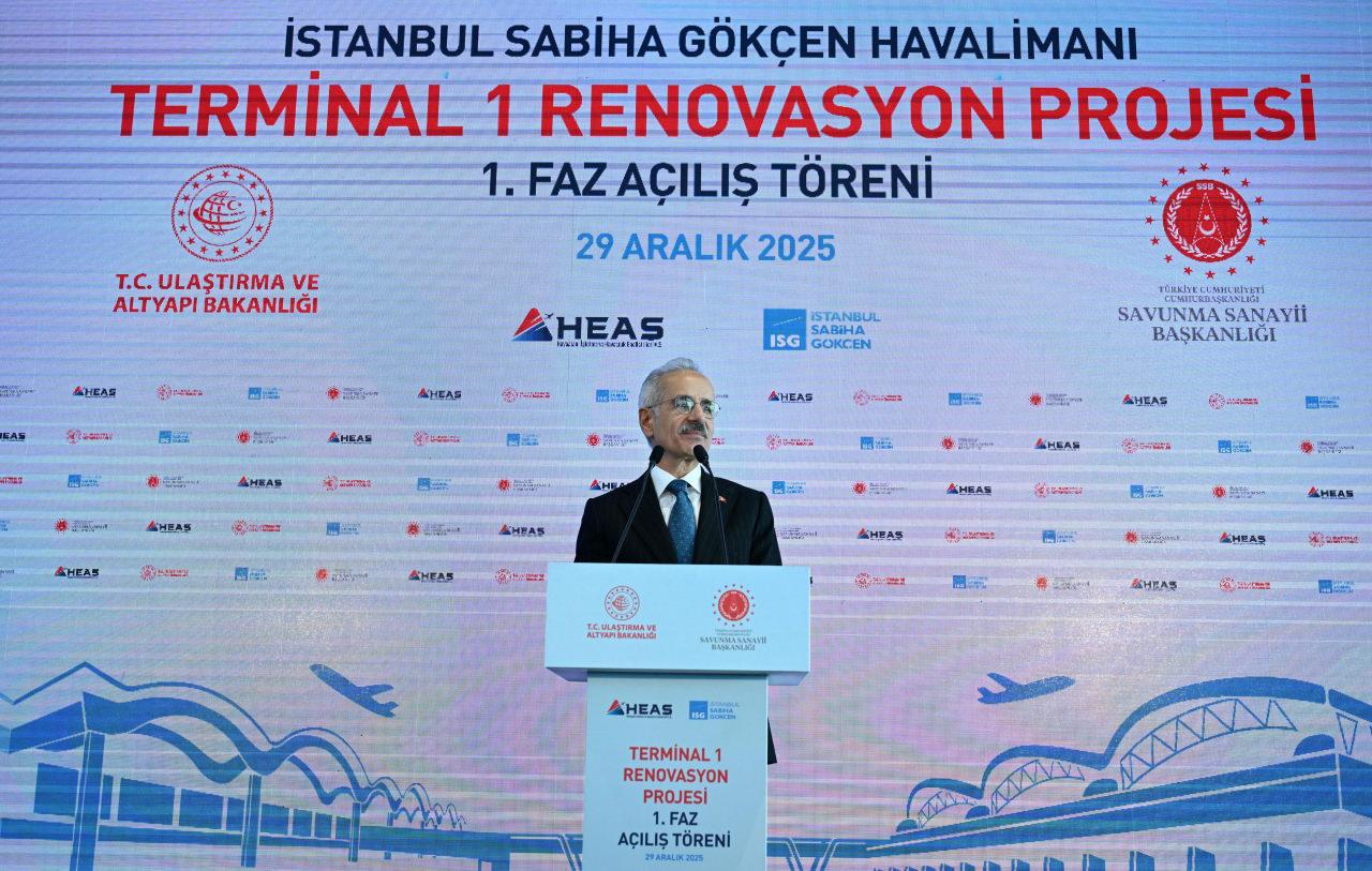 Ulaştırma ve Altyapı Bakanı Abdulkadir Uraloğlu, Sabiha Gökçen Uluslararası Havalimanı “Terminal 1 Renovasyon Projesi 1. Faz Açılış Töreni”nde konuştu. Bakan Uraloğlu, “Yeni yapılan çalışmalarla, ilk terminal binası T1 modern mimarisi, gelişmiş teknolojik altyapısı, yolcu konforuna yönelik çözümleri ve sürdürülebilir yapısıyla yeniden hayat buldu” dedi.