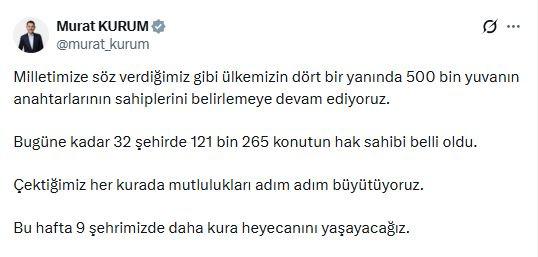 Bakan Kurum, NSosyal hesabından yaptığı paylaşımda, 26-31 Ocak haftasının kura takvimine yer vererek, "Milletimize söz verdiğimiz gibi ülkemizin dört bir yanında 500 bin yuvanın anahtarlarının sahiplerini belirlemeye devam ediyoruz. Bugüne kadar 32 şehirde 121 bin 265 konutun hak sahibi belli oldu. Çektiğimiz her kurada mutlulukları adım adım büyütüyoruz. Bu hafta 9 şehrimizde daha kura heyecanını yaşayacağız." ifadelerini kullandı.
