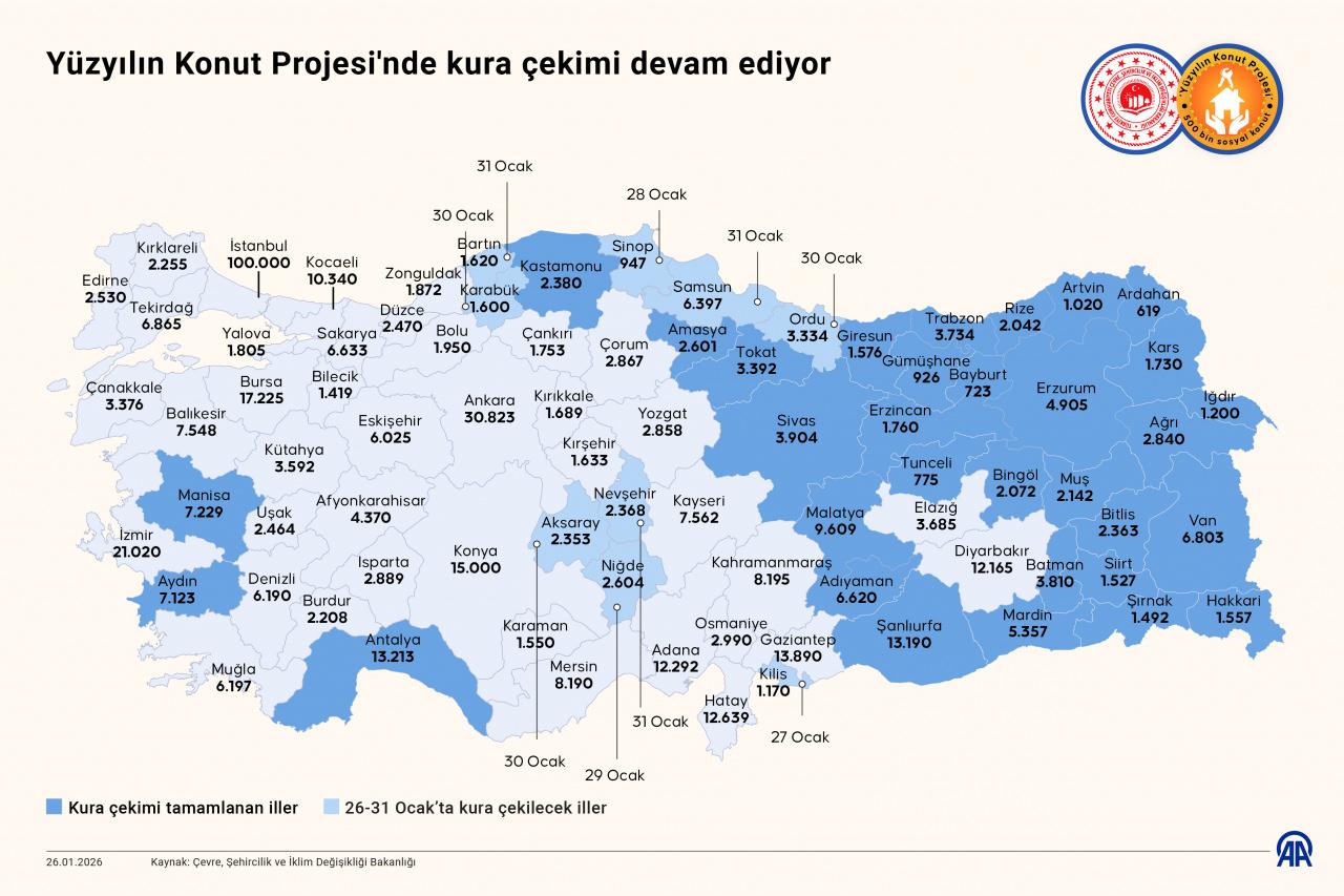 Bugüne kadar Adıyaman, Şırnak, Hakkari, Siirt, Van, Mardin, Ağrı, Batman, Iğdır, Bitlis, Kars, Muş, Ardahan, Antalya, Bingöl, Tunceli, Gümüşhane, Bayburt, Artvin, Rize, Erzurum, Malatya, Erzincan, Şanlıurfa, Trabzon, Tokat, Amasya, Manisa, Sivas, Kastamonu, Aydın ve Giresun olmak üzere toplam 32 ilde 121 bin 265 konutun kurası çekilmiş oldu.