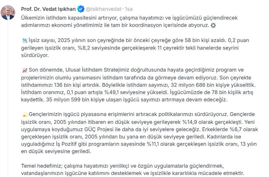 Bakan Vedat Işıkhan, "İşsiz sayısı, 2025 yılının son çeyreğinde bir önceki çeyreğe göre 58 bin kişi azaldı. 0,2 puan gerileyen işsizlik oranı, yüzde 8,2 seviyesinde gerçekleşerek 11 çeyrektir tekli hanelerde seyrini sürdürüyor" dedi.