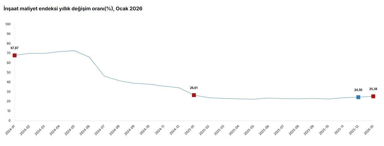 TÜİK, Ocak 2026 dönemine ilişkin inşaat maliyet endeksi verilerini açıkladı. Buna göre; inşaat maliyeti ocak ayında bir önceki aya göre yüzde 9,87 arttı, bir önceki yılın aynı ayına göre yüzde 25,38 arttı. Bir önceki aya göre malzeme endeksi yüzde 3,52 arttı, işçilik endeksi yüzde 21,84 arttı. Ayrıca bir önceki yılın aynı ayına göre malzeme endeksi yüzde 23,32 arttı, işçilik endeksi yüzde 28,83 arttı.