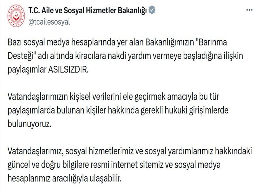 "Bazı sosyal medya hesaplarında yer alan Bakanlığımızın 'barınma desteği' adı altında kiracılara nakdi yardım vermeye başladığına ilişkin paylaşımlar asılsızdır. Vatandaşlarımızın kişisel verilerini ele geçirmek amacıyla bu tür paylaşımlarda bulunan kişiler hakkında gerekli hukuki girişimlerde bulunuyoruz. Vatandaşlarımız, sosyal hizmetlerimiz ve sosyal yardımlarımız hakkındaki güncel ve doğru bilgilere resmi internet sitemiz ve sosyal medya hesaplarımız aracılığıyla ulaşabilir."