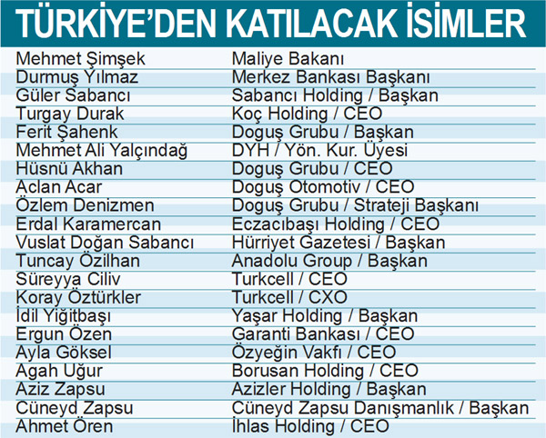 Sabancı Holding Yönetim Kurulu Başkanı Güler Sabancı, Koç Holding CEO’su Turgay Durak, Doğuş Holding Yönetim Kurulu Başkanı Ferit Şahenk, Turkcell CEO’su Süreyya Ciliv zirveye katılacak işadamları listesinde yer alıyor. Bu arada Zapsu kardeşler Aziz ve Cüneyd Zapsu ile birlikte İhlas Holding CEO’su Ahmet Ören de Davos listesinde bulunuyor.