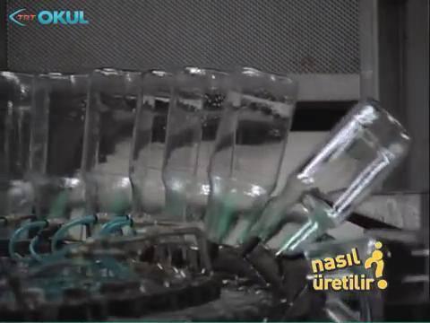 Cam şişeler buharla temizlendikten sonra, mekanik kollarla ters çevrilerek içinde kalan sulardan arındırılıyor.