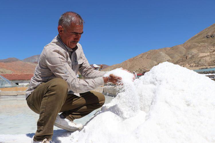 Tesiste çalışan Veli Toprak da sıcak havada tuz havuzlarında çalışmanın zorluğuna dikkati çekti.