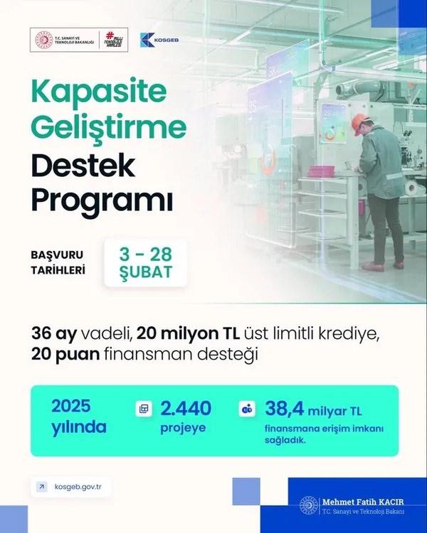 Paylaşımında, “KOBİ’lerimizi büyütmeye, üretimi ve istihdamı güçlendirmeye devam ediyoruz. KOSGEB Kapasite Geliştirme Destek Programı 2026 yılı 1. dönem başvurularını başlattık.20 milyon TL üst limitli 36 ay vadeli krediler için 20 puanlık finansman desteği sunuyoruz. 2025'te 2 bin 440 işletmeye 38,4 milyar TL finansmana erişim imkânı sağladık. Daha güçlü, daha üretken bir Türkiye için işletmelerimizin yanındayız.” ifadelerini kullandı.